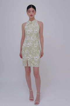 Sleeveless Floral Printed Cheongsam in Midori Green